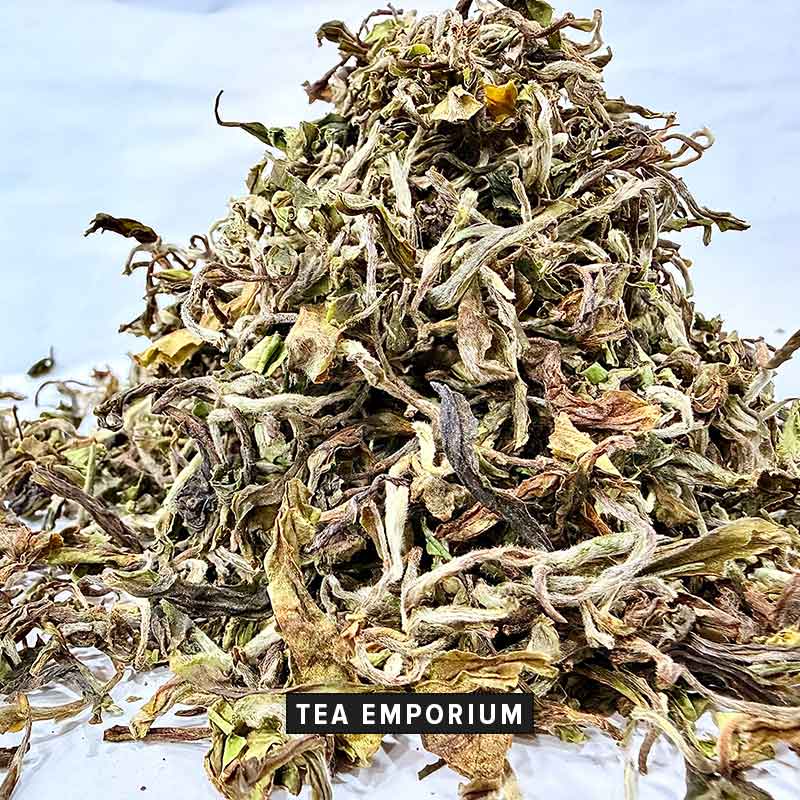 The dry leaf unveils a captivating aromatic profile – richly floral with pronounced notes of jasmine, elegantly layered with fresh geranium and highlighted by subtle hints of raw mango, offering a refreshing and inviting bouquet.
